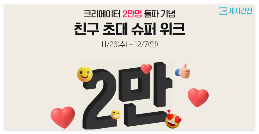 세시간전이 2만 명 돌파 이벤트를 진행 중입니다. 지금 신규 크리에이터로 가입하면 신규가입자 2,000원 리워드를 즉시 지급해줍니다.