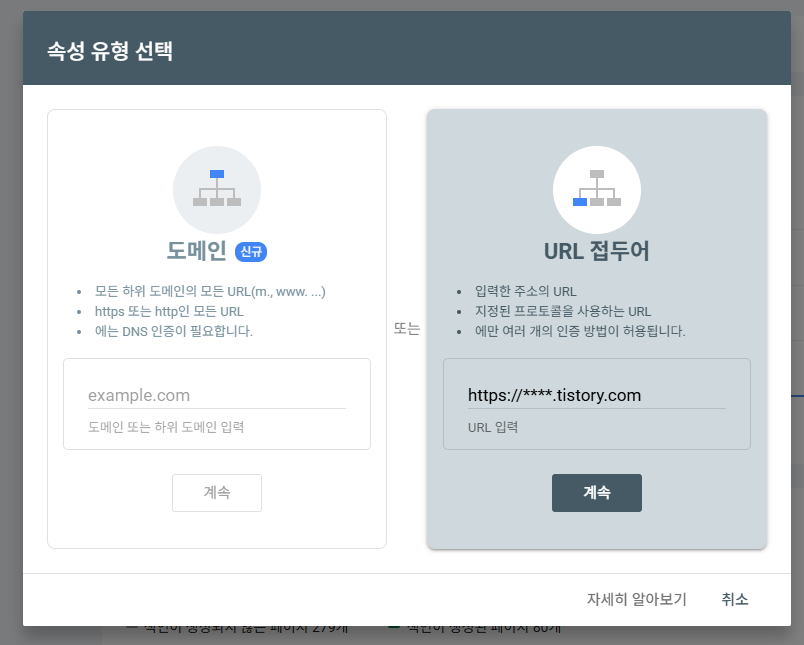 - URL 접두어 등록: https://****.tistory.com 형태의 주소라면 이 옵션 선택하세요. 일반적인 티스토리 블로거 분들 대부분에 해당합니다.