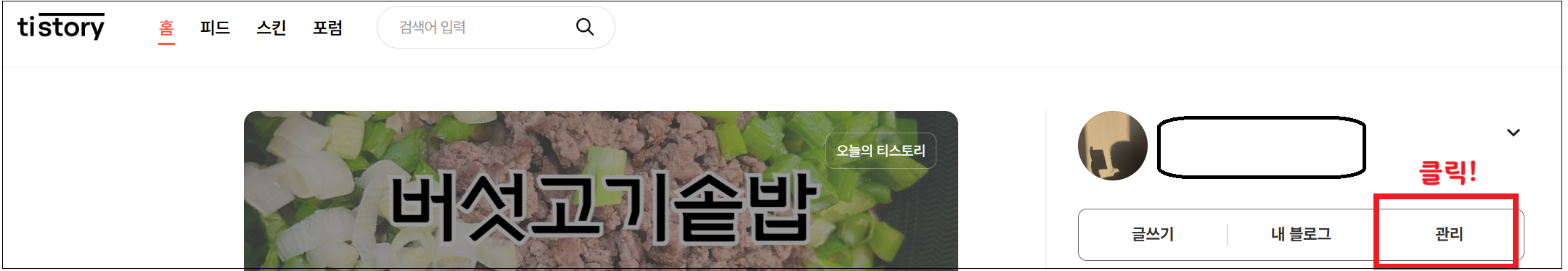 1. 티스토리 처음 접속화면에서 관리로 들어가면, 티스토리 블로그관리 홈으로 들어가게 됩니다.