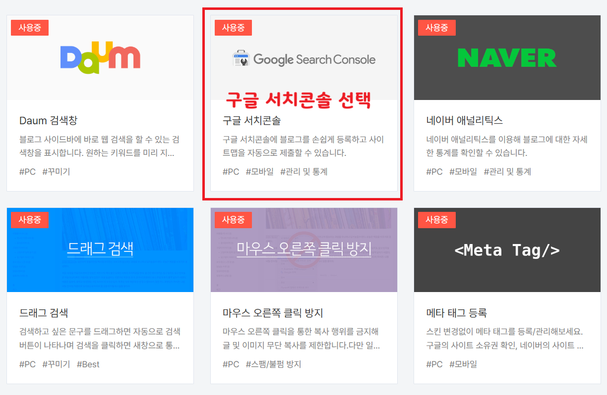 티스토리는 편리하게 구글서치콘솔에 등록할 수 있는 플러그인을 제공하고 있어요.