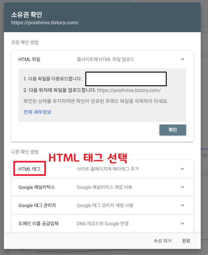 - 소유권 확인 방식 중에 ‘HTML 태그’ 방식을 선택하세요.