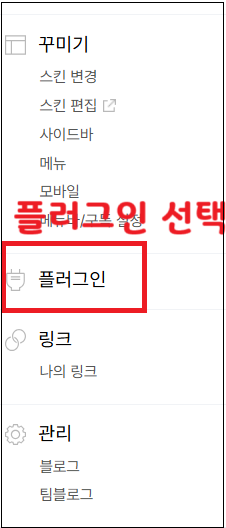 2. 티스토리 블로그관리 홈 좌측 목록에서 플러그인을 선택합니다.