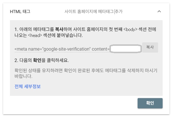 3단계. 사이트 소유권 확인 – HTML 태그 복사
