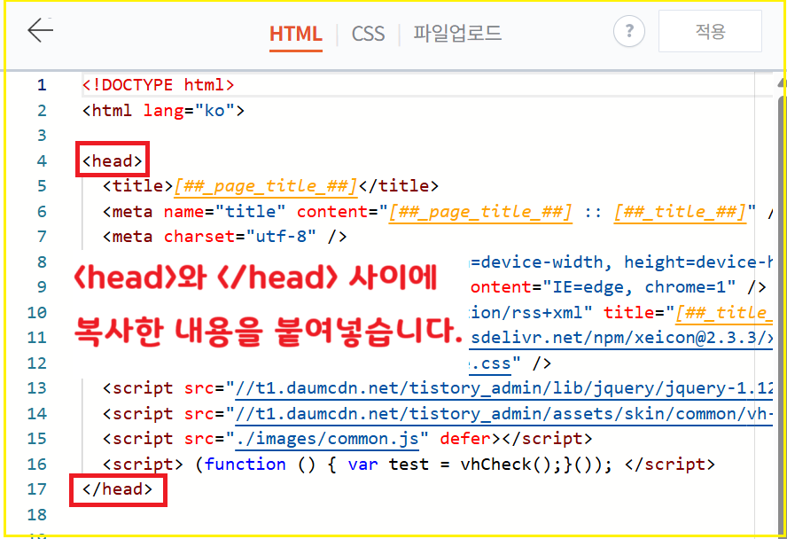 4단계. 티스토리 관리자에서 HTML 태그 삽입